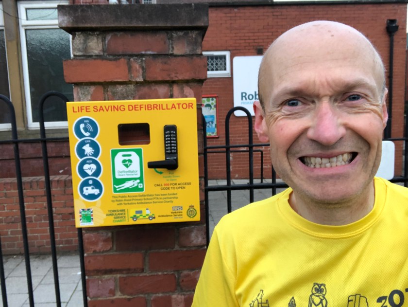 As I passed Robin Hood School (Yes, Robin Hood really is the name of a village between Wakefield and Leeds) I noticed this yellow box on the wall and discovered it was a public access defibrillator, just like the sort for which I am raising money. I couldn’t resist the selfie to show everyone what one looks like and what’s displayed on the outside to tell people what to do in the event they need to use the device. As well as purchasing the equipment, it needs to be connected to power (to keep it charged) and it needs to be regularly serviced by a professional, hence the estimated £2,000 price tag.